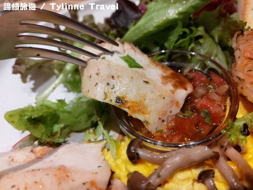 鬆餅的部分有兩小塊,一個吃原味另一個搭配莎莎醬吃,原味吃起來香氣十足,搭配酸甜莎莎醬吃起來開胃解膩