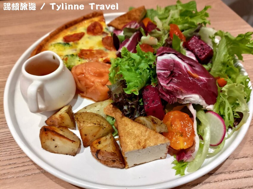 鹹派裡面有非常多的蔬果,吃起來紮實夠味,獨家醬汁有點像是泰式口味,淋上去一起吃非常開胃