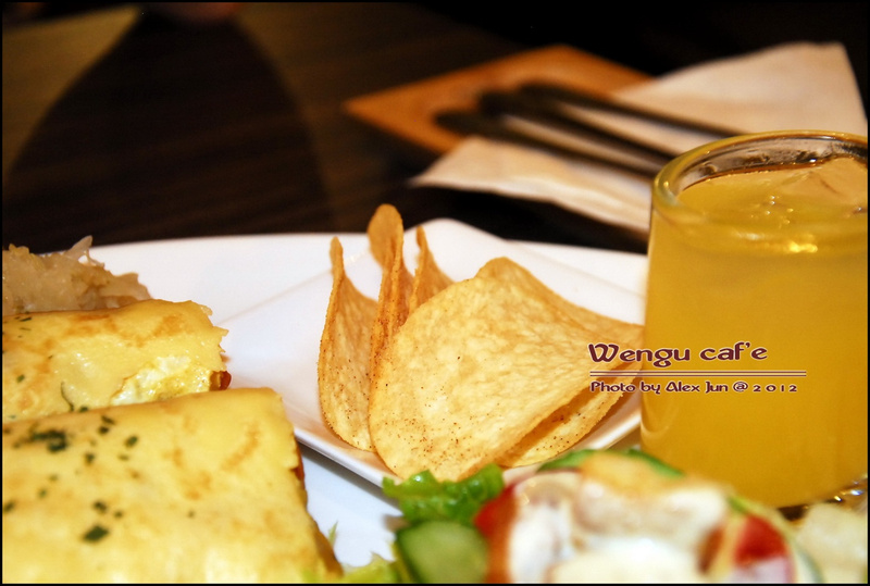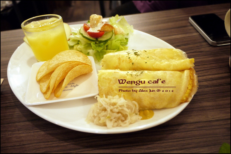 除了薄餅蛋捲,還有沙拉、洋芋片、果汁及一點點的德國酸菜。