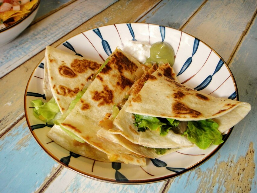 「墨式香料起司豬肉薄餅」看出主廚真功夫!薄餅細緻綿軟,內餡包有彩椒、焦糖洋蔥、生菜、起司等,配上香料豬肉,單吃就好吃,再沾上酸奶、酪梨醬清爽解膩,大人小孩都喜歡。
