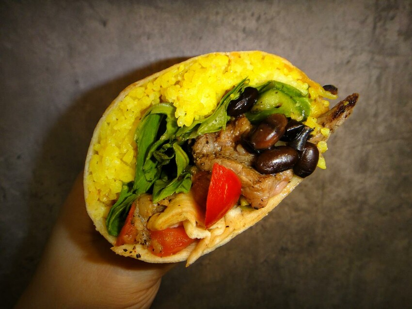 別具特色的「烤牛肉條捲餅」使用墨西哥餅皮包入番茄、洋蔥丁、生菜、起司、黑豆、薑黃飯,還有烤牛肉條。大口咬下捲餅,薑黃飯香氣四溢,金黃誘人;烤牛肉條滑嫩多汁,飽滿又扎實的捲餅份量十足,吃完飽足感滿點。