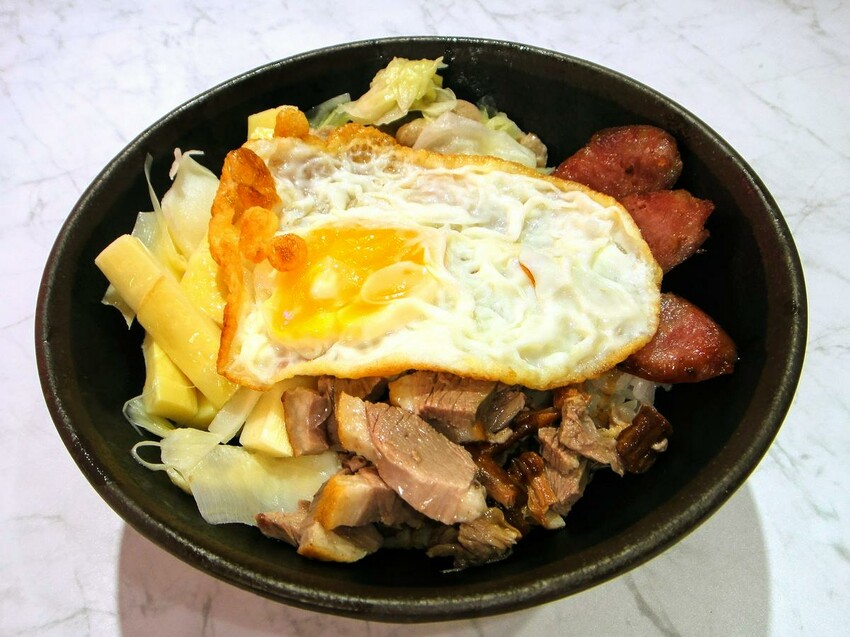 「招牌鵝肉飯加蛋」可一次品嚐店家多種美味!鵝油飯再加上香腸、桂竹筍、切丁鵝肉、高麗菜、鵝肉香腸、荷包蛋等配菜,琳瑯滿目的食材,鹹香有味,鵝肉、蔬菜、蛋應有盡有,營養均衡又能大飽口服,CP值超高。