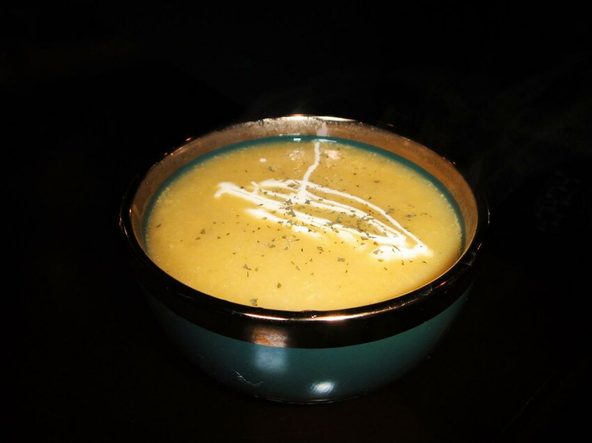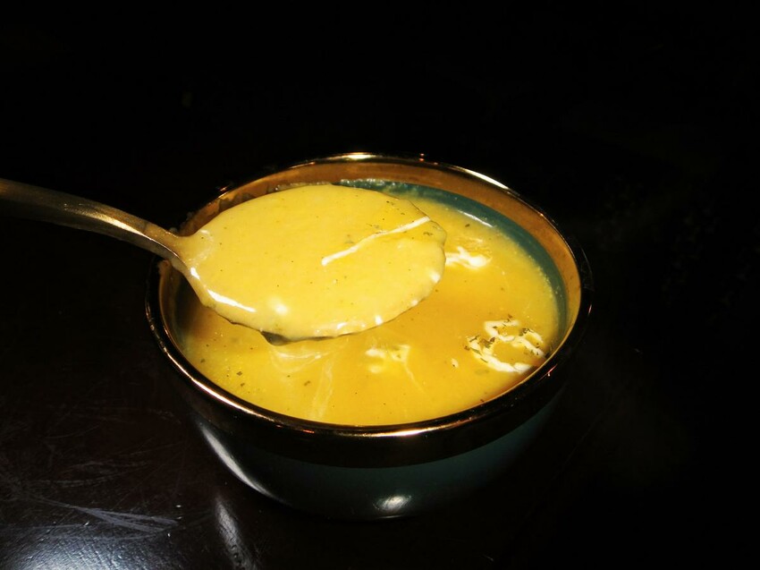 「南瓜濃湯」濃湯呈現明亮橘黃色,上面有美麗白色奶油拉花,聞得到濃濃南瓜味,喝起綿密柔軟,濃郁香甜,美味又有飽足感。