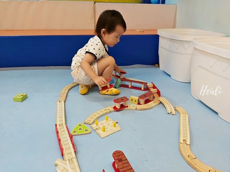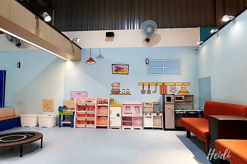 再往裡面走這區比較靜態,有廚房玩具、積木、火車軌道等,爸媽可以在旁邊的沙發區休息。