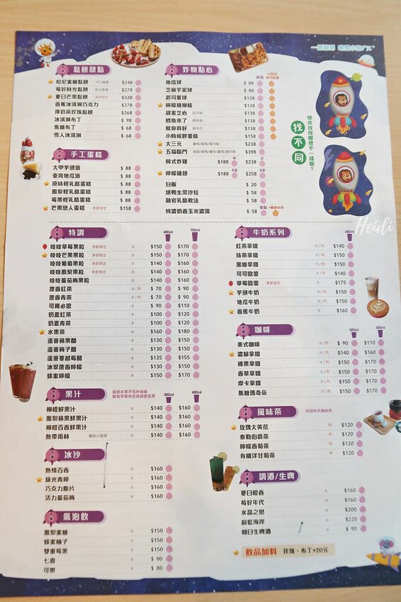 背面有鬆餅、甜點、手工蛋糕、炸物點心、飲料,