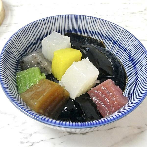 七彩粉粿,由紅薯粉熬製,軟嫩帶有Q口感,凝結兒童時記憶,日本日式吃法,抹茶、芝麻、桂花、玫瑰、椰漿、黑糖、山槴子,是覓糖為粉粿添加的七種色彩,讓你擁有彩虹般的心情。