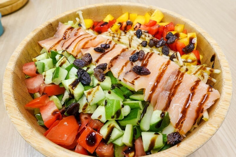 滿滿一盆,有彩椒、小黃瓜、青木瓜絲、葡萄乾……多種蔬菜,再加上滿滿的煙燻鮭魚,配上蜂蜜芥末醬!超級好吃!我一個人就快吃一盆!夏天點一盆沙拉清爽,既可以解膩又可以攝取足夠的蔬菜,還有鮭魚的營養!