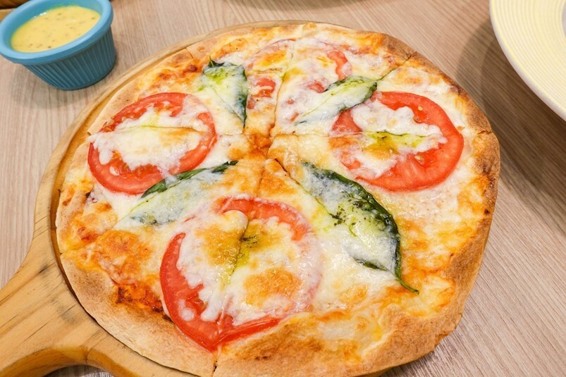上桌建議趕快吃可以吃到餅皮脆脆的口感!配料有九層塔、番茄,搭配起來是100分的瑪格麗特比薩!也是一口接著一口停不下來!