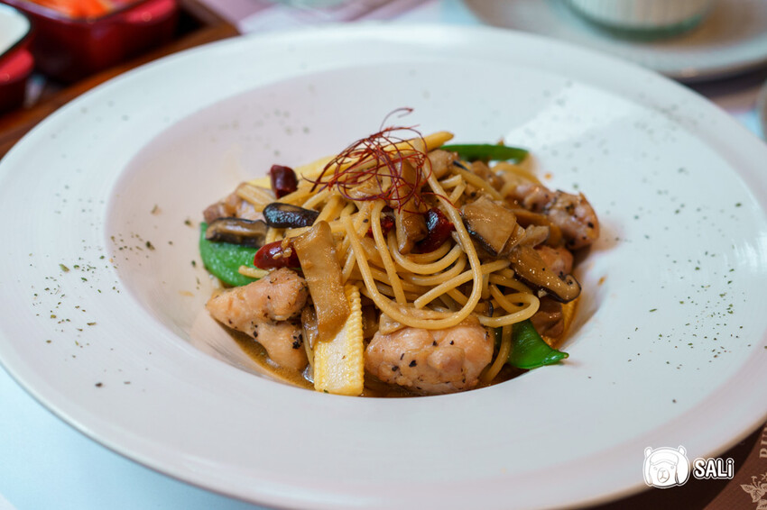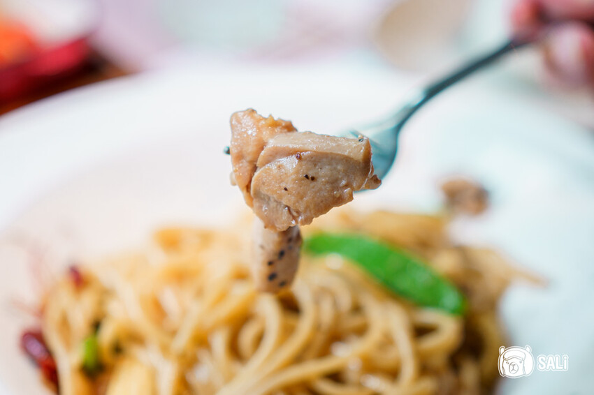 以清炒方式料理,再添加椒麻油提香,Q彈的麵條吸附滿滿湯汁,吃起來軟硬適中,有著宜人的辣度,但不過度刺激,風味令人驚艷,有著多款鮮蔬,搭配著帶皮的去骨雞腿肉丁,肉質軟嫩鹹香,這盤好吃到三兩下就被掃盤啦