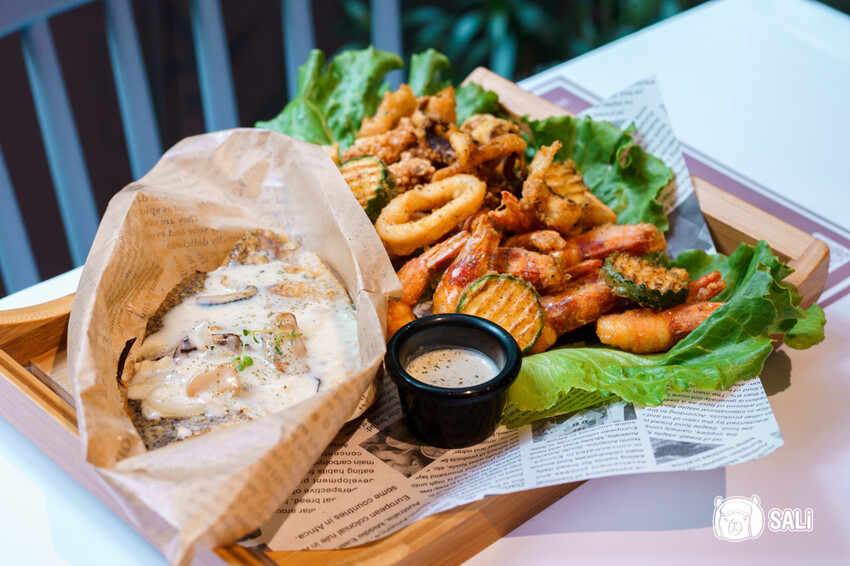 魷魚、鮮蝦、土魠魚塊、以橄欖油與胡椒醃製後輕炸,表層香香酥酥不會搶走食材原先風味,若想要味道更濃郁,可沾點醬汁品嚐,風味也很不賴,越吃越想來杯邪惡飲品搭配應該更過癮