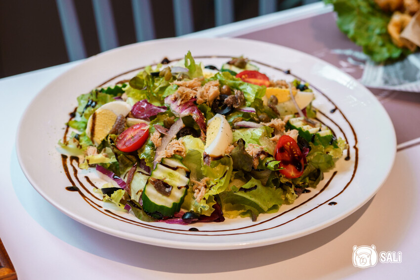 運用多款鮮蔬,搭配著水煮蛋、黑橄欖、鯷魚、鮪魚,淋上巴薩米克醋點綴風味,微微的鹹味和回甘感,整體吃起來相當清爽,更能在品嚐主餐前打開我們的味蕾