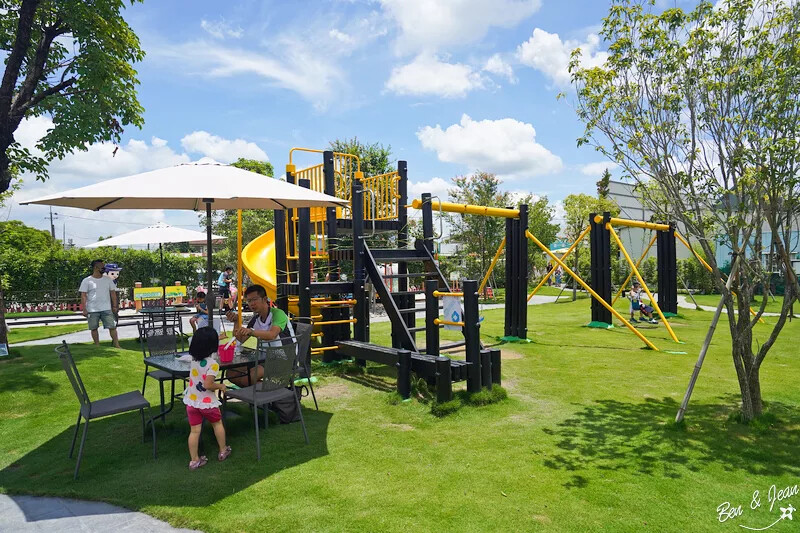 這個沙坑不大,但上方有遮陽的部份,小朋友真的都不怕熱,玩的不亦樂乎,一旁設有清洗區,可以放心玩。