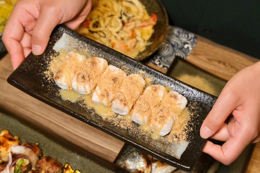 ▼最後的甜點推薦來份現烤麻糬燒,淋上煉乳再灑滿花生粉邪惡加倍,外皮咬起來微酥,軟糯中帶有黏性的QQ口感,香甜滋味讓人一吃就愛!