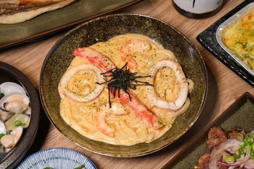 ▼絕對不能錯過的白醬海鮮炒烏龍,香濃的白醬扒著Q彈的麵條,吃起來有著大火快炒的鍋氣,海鮮用料更是實在,吃得到不少鮮蝦和肥厚中卷等食材!