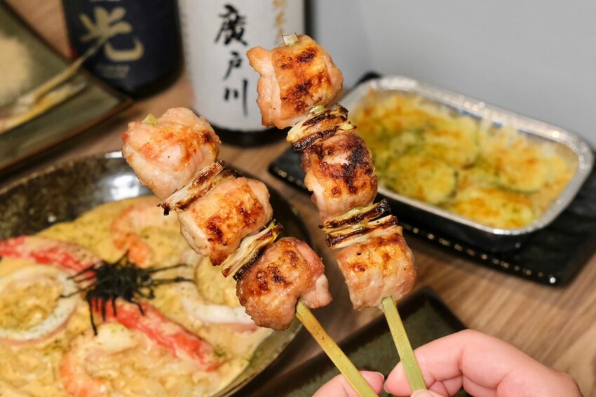 ▼【暮樂町居酒屋】主打的串燒使用純木炭爐烤,透過炭香與肉香結合出極致美味,每樣都串得很整齊衛生,讓大家多了一份保障及安心。