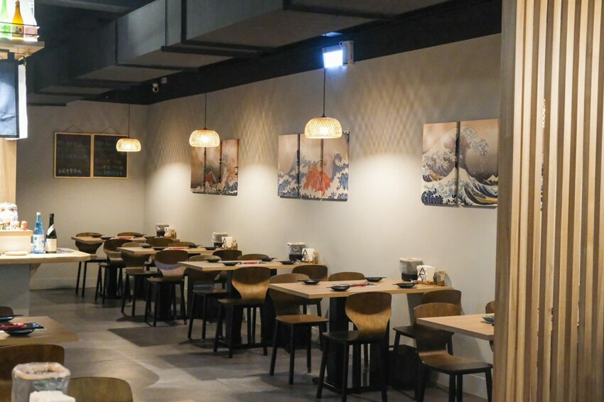 ▼【暮樂町居酒屋】用餐環境充滿日式風情,以兩~六人座位為主,還有適合一人的吧檯座位,整體乾淨且明亮,採用木頭設計和日本壁畫等小物擺設,打造出質感舒適的文青風氛圍。