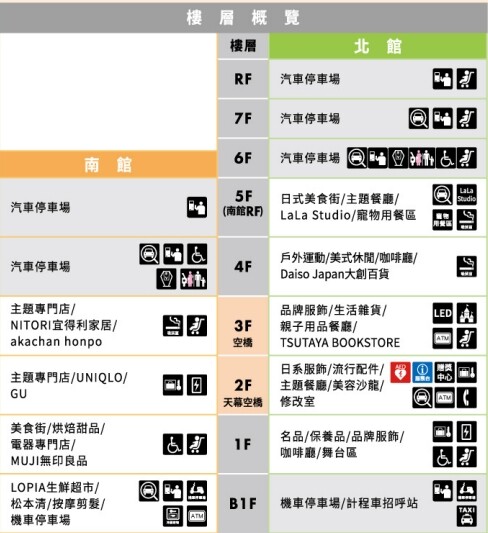 南館最頂樓兩層是汽車停車場,2~3樓是品牌商店,1樓主要是美食街和無印良品,B1除了機車停車場,還有一個必逛的LOPIA生鮮超市,很好買哦XD。