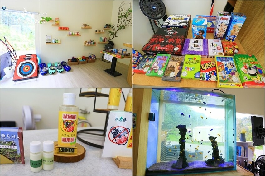 一旁擺放了多元豐富的球類、球拍、射箭及各種受歡迎的桌遊,