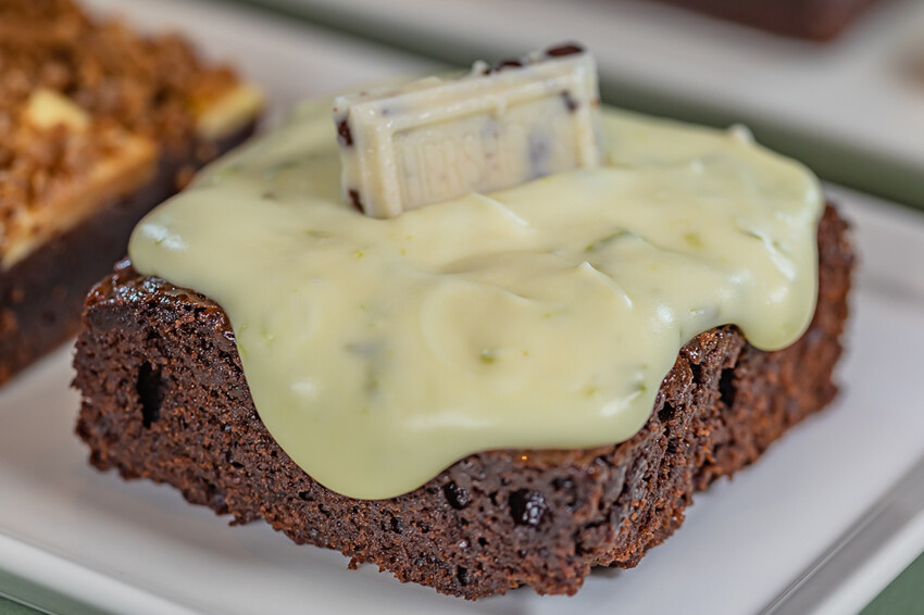 ▲它的外觀就很吸引人,上面鋪了一層 HERSHEY’S 好時巧酥可可風味片,增加了層次感和酥脆的口感。下面則是濕潤而緻密的布朗尼,帶有深厚的巧克力風味。最精彩的部分是中間的檸檬白巧力淋醬,它是用新鮮檸檬製作的,還刨了一些檸檬絲在上面,讓整個甜點散發出清新的香氣。