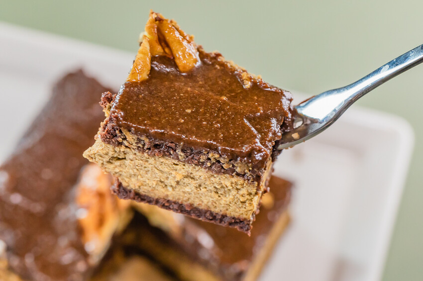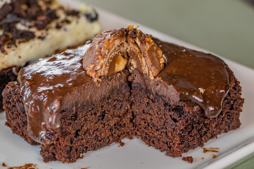 ▲▼濃郁濕潤的巧克力布朗尼,上方淋上碎榛果苦甜巧克力甘納許,十足的金莎巧克力風味。