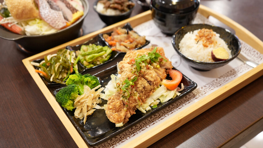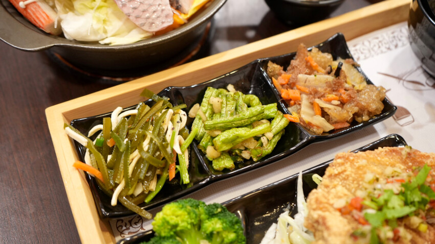 定食裡面有多款配菜,味道鹹香入口清爽,都是夏季很對味的開胃菜,還有好喝的湯品、香鬆飯。
