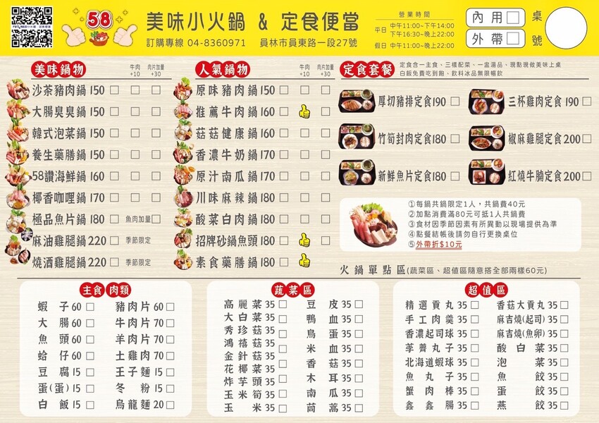 | 58讚小火鍋.定食便當 地址:彰化縣員林市員東路一段25號 電話:04-8360971 營業時間: 平日 11:00-14:00、16:30-22:00 假日 11:00-22:00 FB粉絲團 |