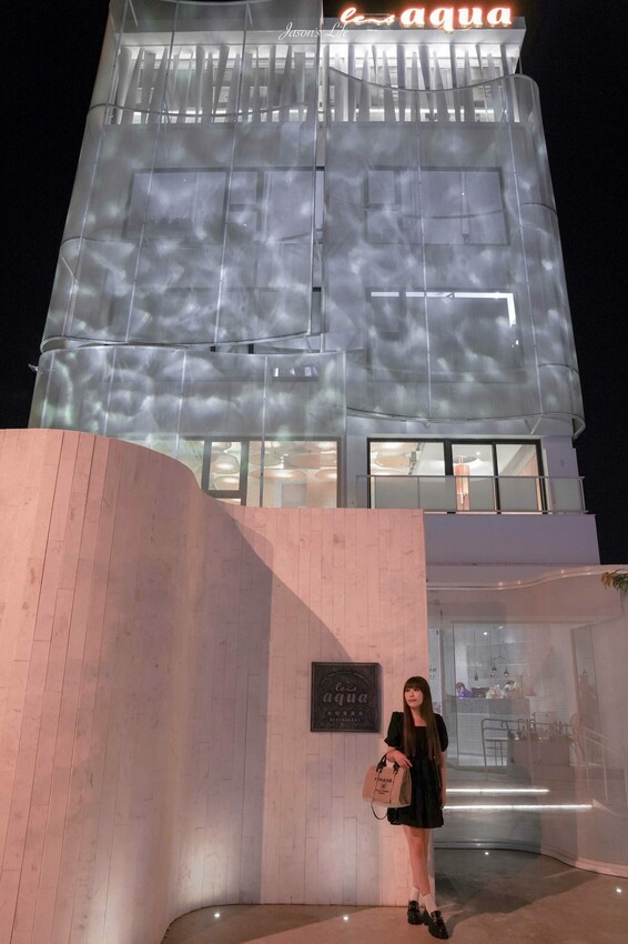 晚上的時候,建築物外觀還打上水波紋的燈光效果,呼應店名