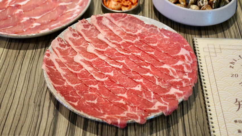店裡的肉片都是老闆現點現切,在知灃號可以吃到日本A5和牛,也有較平價的美國安格斯牛,當然喜歡吃豬肉的朋友這邊也有台灣豬可以選擇。