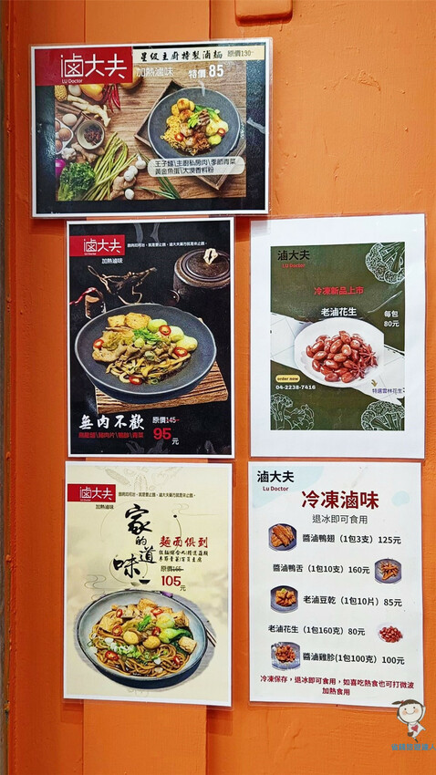 櫃檯旁邊的橘色牆面還有許多主廚私房滷味的介紹,以及方便外帶回家的冷凍滷味