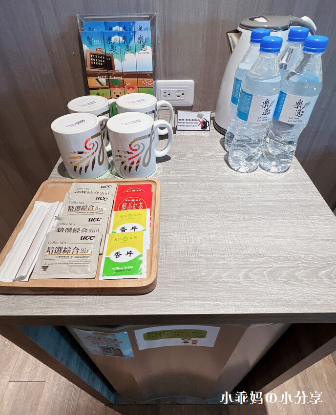 有提供免費的四瓶裝水、杯子、茶包、咖啡包
