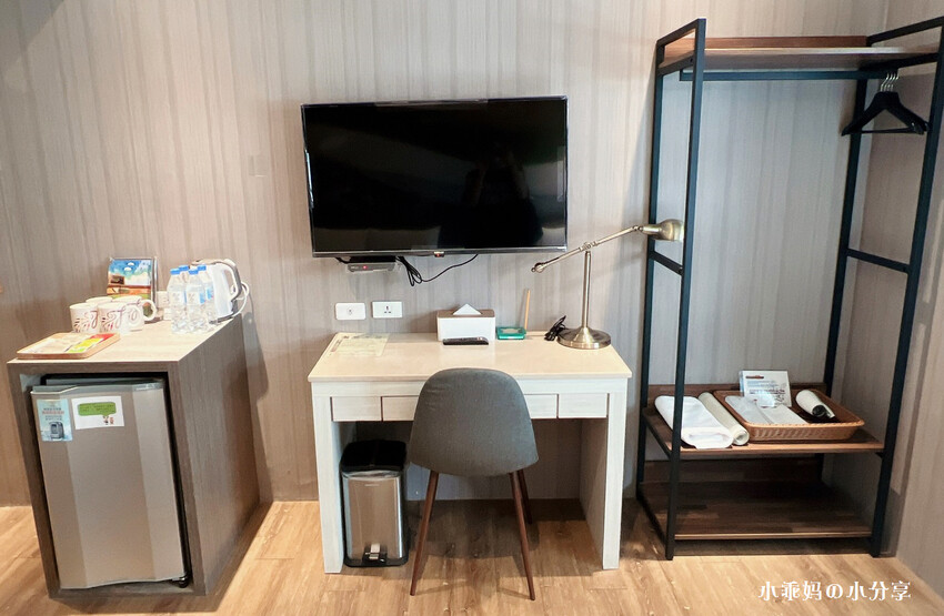 有掛吊衣物的空間,附有紙拖鞋、吹風機..