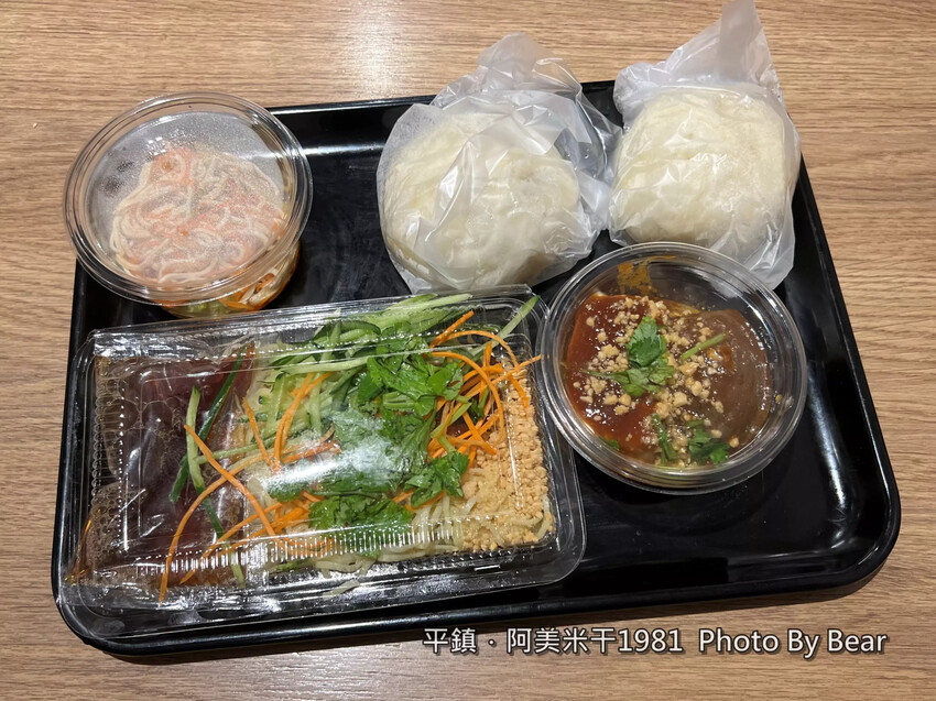 有兩個破酥包子($30/個)和一個豆乾絲($35/盒)是老妹的