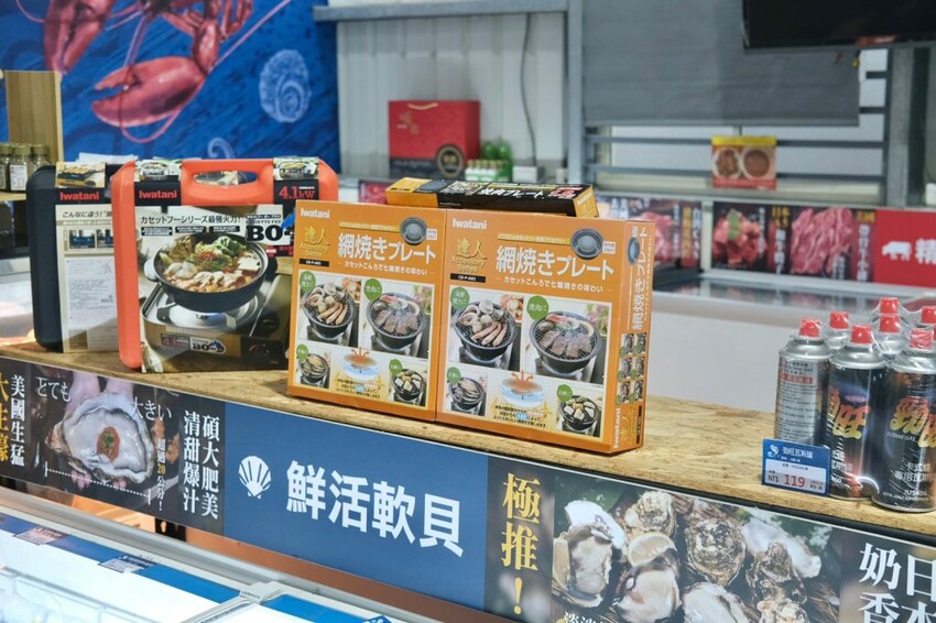 ▼烤肉火鍋的周邊食材及工具,烤爐、木炭、炭晶、日本空運卡斯爐、日本烤肉爐,多款風味的調味料等商品也有。