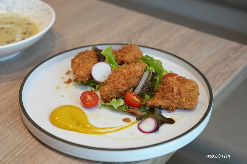 一口咬下有著外酥內軟的口感,可以看到麵衣非常薄、裡面是肥美的牡蠣