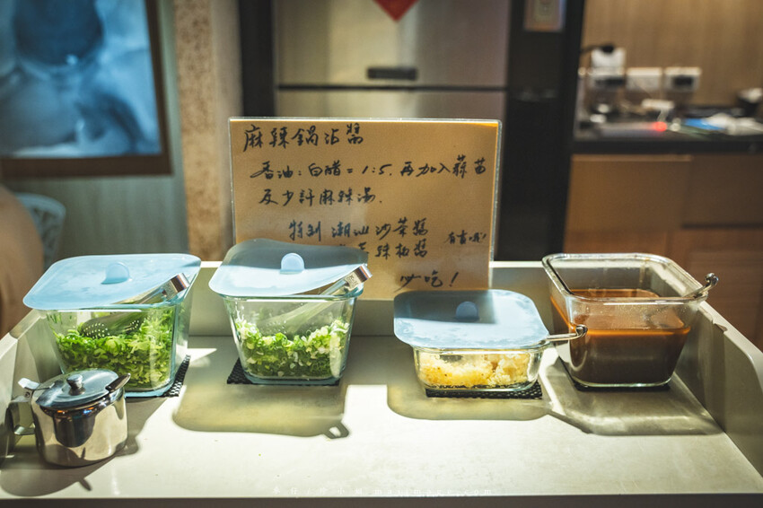 旁邊的醬料區採自助式就自己拿,如果不知道要怎麼搭配這裡有老闆的麻辣鍋沾醬的完美比例。