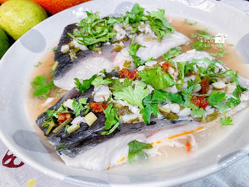 酸香風味的檸檬魚蒸好了,挑掉變黃的香菜換上撩視覺的新鮮香菜襯色,再噴一點點香油就可以開吃了
