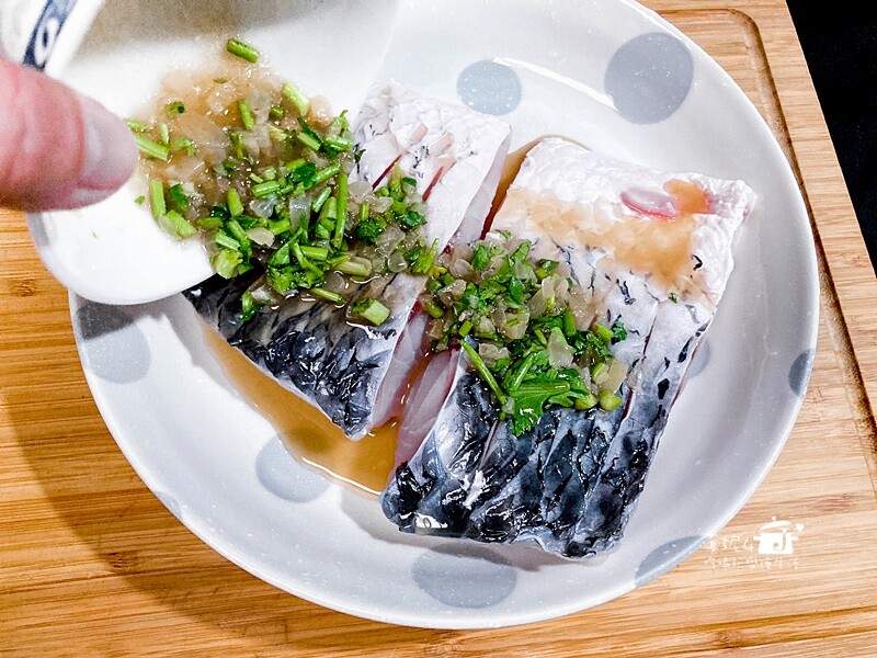 1.草魚塊洗乾淨後在厚實的部位畫幾刀(不切斷),方便醃料汁滲入魚纖維裡