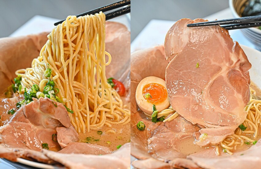 吸吮細拉麵時,濃稠的湯汁會被夾帶上來,再搭配三片舒肥嫩叉燒、三片微炙燒的叉燒,肉多湯濃,好好吃、非常過癮!
