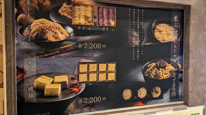 KURIRIN的招牌是用最高級的2種和栗所做的「黃金蒙布朗」,如果想嚐試多種口感變化可以選擇有搭配培茶、鹽味冰淇淋、栗子甘露煮等小盤一起搭著吃的「栗三味」,或是搭配季節水果的組合,不想吃栗子的話也有紅芋可選擇。