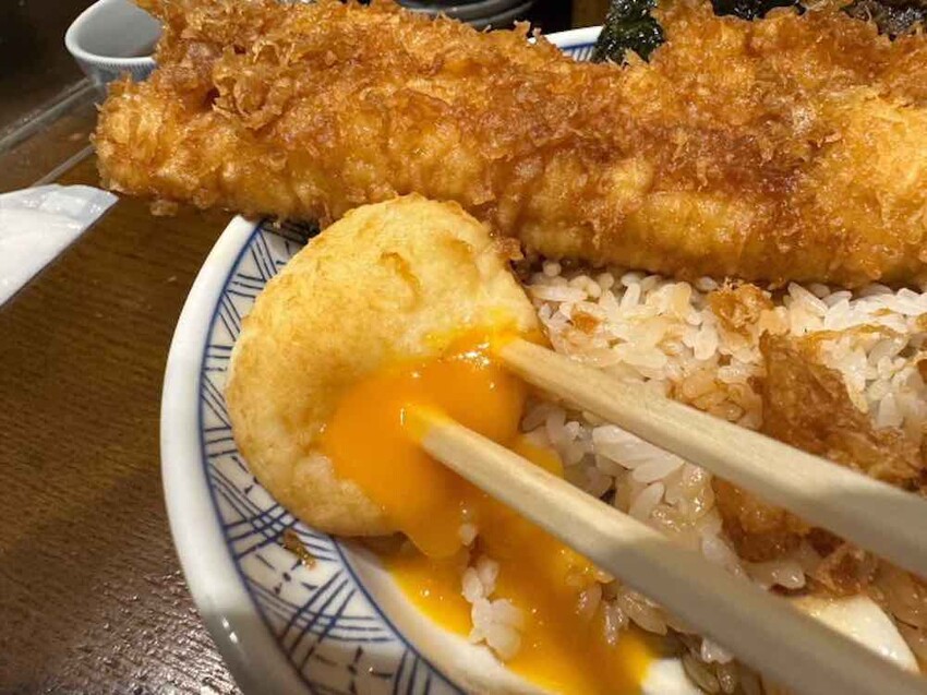 天丼端上來炸得金黃的穴子魚、2條蝦子、干貝、魷魚海鮮炸、半熟卵滿滿地把白飯都蓋住,雖然整碗都是炸物,但是完全不膩,一瞬間一碗天丼就可以吃光光!