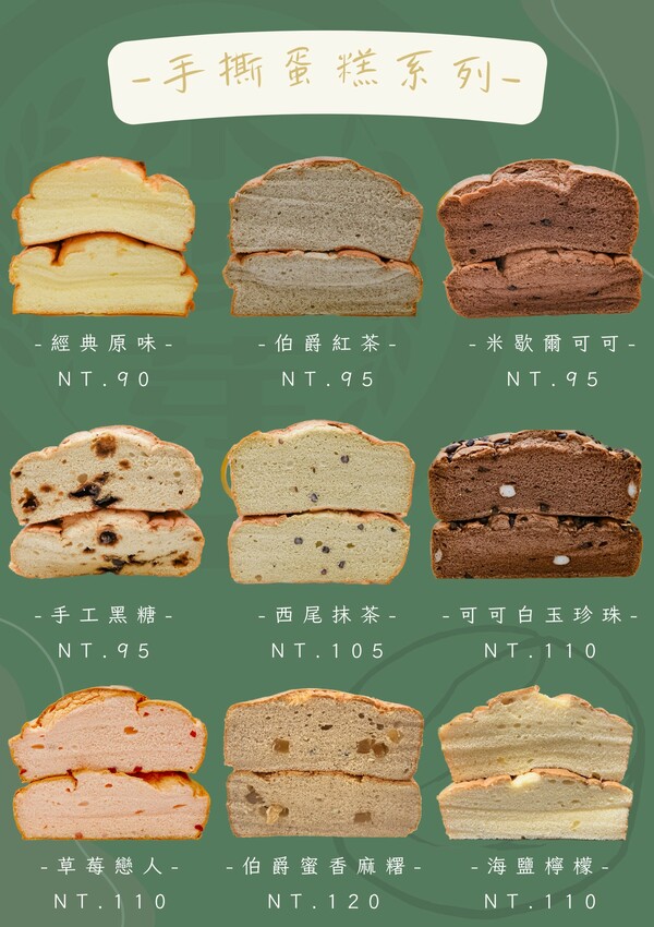 古早味手撕蛋糕有經典原味、伯爵紅茶、米歇爾可可、手工黑糖、西尾抹茶、可可白玉珍珠、草莓戀人、伯爵蜜香麻糬和海鹽檸檬。