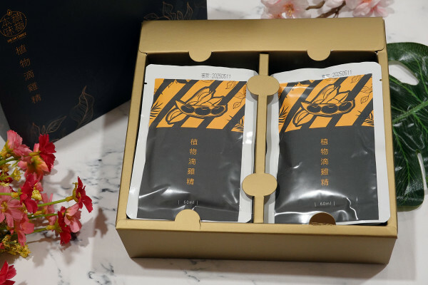 抽拉式設計的禮盒,裡面擺放14入單包包裝的素食滴雞精,方便攜帶也很衛生安心。