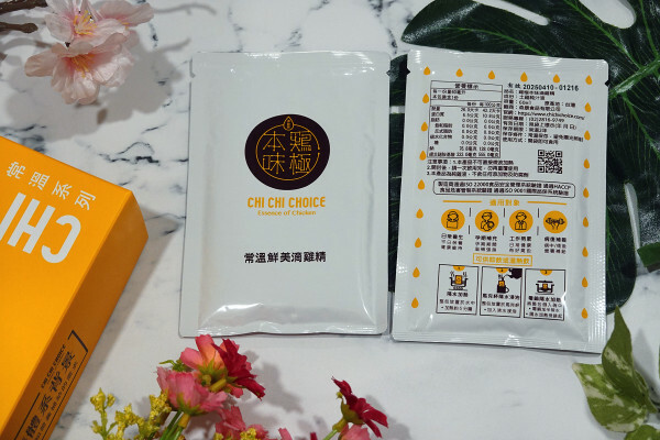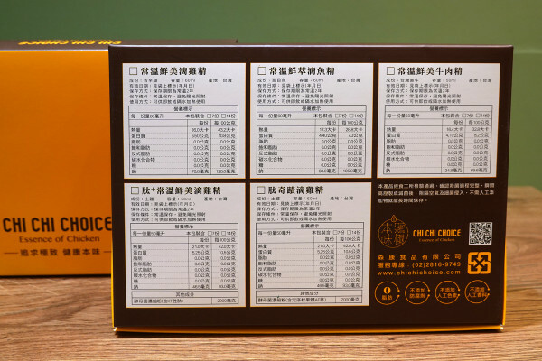 包裝上印有雞極本味的英文名稱,Chi Chi Choice除了有「積極的選擇」之意也意味著「雞精的選擇」,也帶出雞極本味滴雞精、滴魚精、牛肉精帶著「追求極致健康本味」的這份心意與精神,透過精釀香醇的產品來滿足現代人的需求。