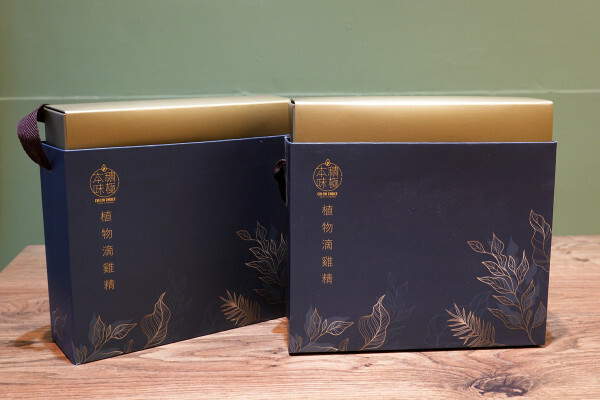 雞極本味植物滴雞精禮盒是藍色配金色的包裝,質感很好的提繩式禮盒上面印了許多植物的圖案,很符合植物滴雞精的訴求。