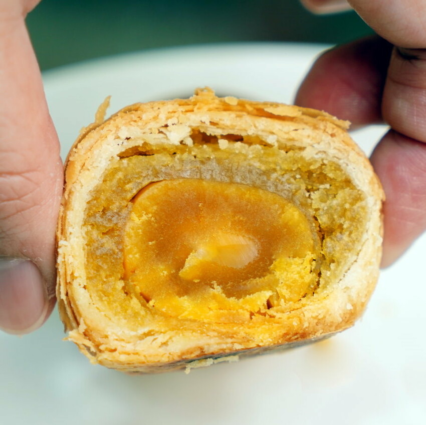 ▼月光蛋黃酥也是店內獨創商品,採用地瓜內餡搭配烘烤過的鹹蛋黃,剛出爐的外皮更是香酥脆口,加上帶點蜜香的地瓜內餡、鹹蛋黃頗為合拍,吃起來也較不膩口,真的很特別!
