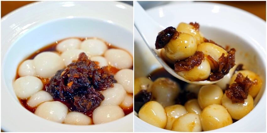▼甜粄圓,這款也是比較傳統的客家吃法,以手搓湯圓加上桂圓、寶山紅糖、薑下去熬製,尤其薑、糖要熬煮到濃稠帶點膠狀才是道地的客家風味;渾圓飽滿又Q彈的口感,搭配薑香、桂圓的香味,溫醇又甜蜜的滋味讓人一吃就愛上!