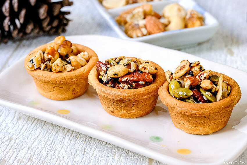 自己做的塔皮也是減糖配方,主要就是麵粉、蛋這些基本食材,加上他們烤焙得很酥脆,很像吃餅乾的口感,跟綜合堅果配起來涮嘴可口,配著茶或咖啡吃很搭~