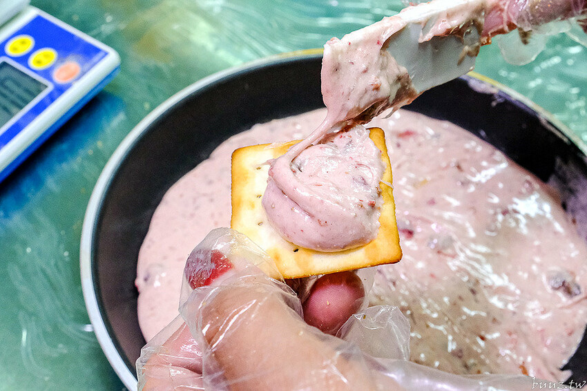 像這天就是製作香水草莓牛嘎餅,裡面還有加入了義美的乾燥草莓、草莓果乾等去打成的夾心餡。