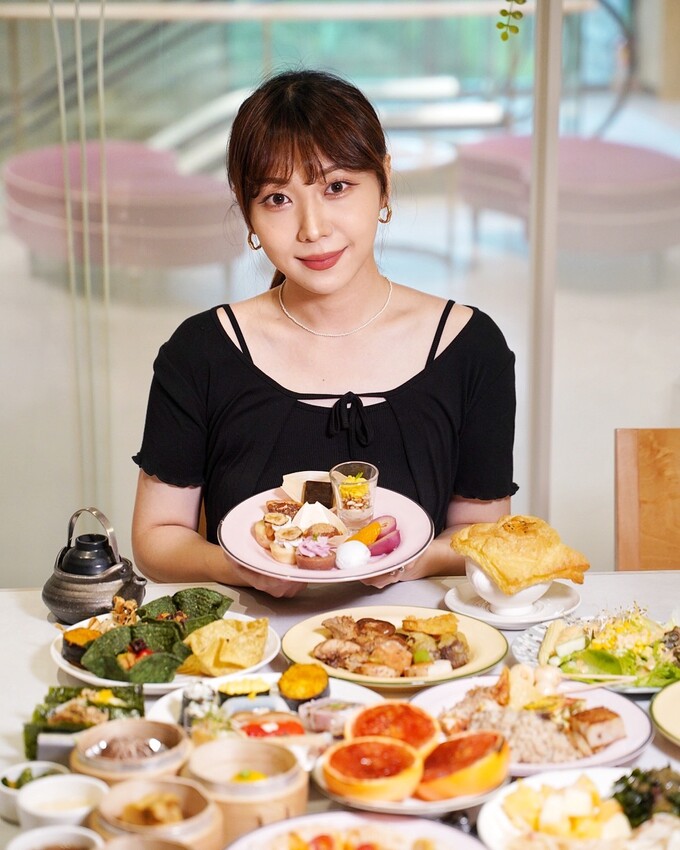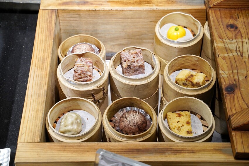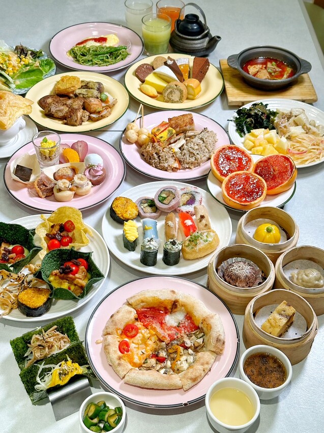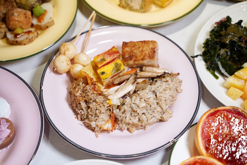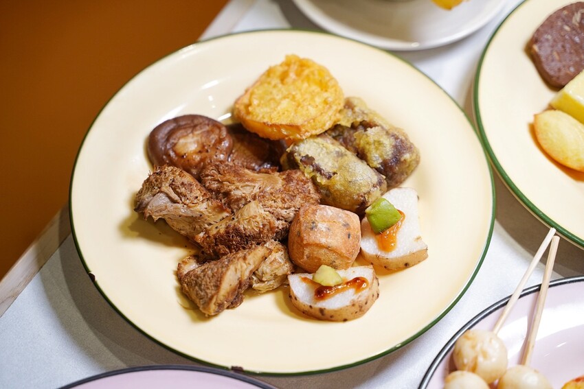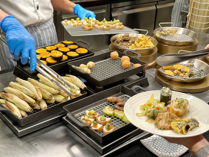 每個壽司都有放上提香增色的佐料,相當精緻,裡頭印象最深的是芋泥烤麩壽司捲,以綿密芋泥來取代米飯,包入各種配料,色澤真的很美又好吃。日料區的炸物有紅豆年糕、海花草菇天婦羅、鮮蔬天婦羅、杏鮑菇唐揚、牛蒡天婦羅、脆皮芝麻小丸子等等,其中「杏鮑菇唐揚」外脆內多汁的口感,吃完立馬再去夾了第二盤。烤物部分,有味噌蛋黃山藥燒、烤佛手瓜佐山葵椒鹽、烤玉米筍、黑糖花生烤麻糬、烤飯糰,裡頭我最喜歡「味噌蛋黃山藥燒」,以日本進口食材製作,還以酪梨來點綴,是很日式風格的味道。最後日料區蒸物有蕈菇土瓶蒸、松露茶碗蒸,兩款都蠻喜歡的。