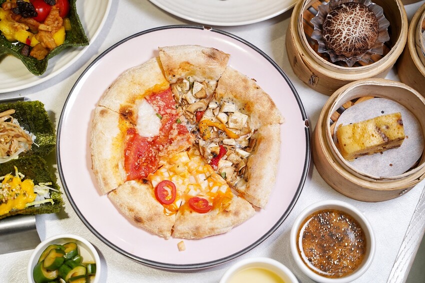 使用義大利進口石磨小麥麵製作的薄皮Pizza,餅皮咬起來香甜的麵粉香氣,搭配起司、時蔬,真的完全不輸葷食的Pizza。